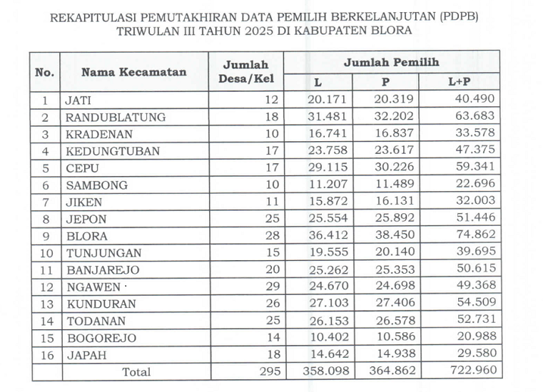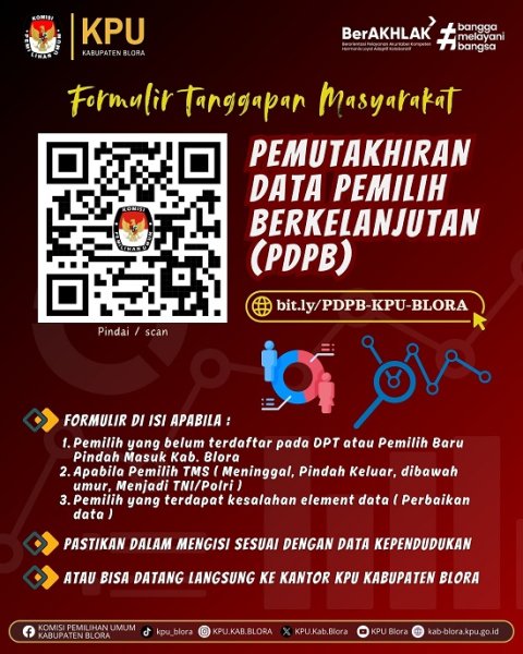 Pengumuman Rekapitulasi Pemutakhiran Data Pemilih Berkelanjutan Triwulan III Tahun 2025 di Kabupaten Blora Kamis, 02 Oktober 2025 15:38 10 SK KPU Kabupaten Blora Nomor : 12 Tahun 2025 tentang Penetapan Rekapitulasi Pemutakhiran Data Pemilih Berkelanjutan Triwulan III Tahun 2025 di Kabupaten Blora. KLIK DISINI Bagikan: Telah dilihat 10 kali