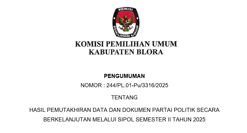 PENGUMUMAN TENTANG HASIL PEMUTAKHIRAN DATA DAN DOKUMEN PARTAI POLITIK SECARA BERKELANJUTAN MELALUI SIPOL SEMESTER II TAHUN 2025 Rabu, 31 Desember 2025 11:55 87 PENGUMUMAN TENTANG HASIL PEMUTAKHIRAN DATA DAN DOKUMEN PARTAI POLITIK SECARA BERKELANJUTAN MELALUI SIPOL SEMESTER II TAHUN 2025 DAPAT DI UNDUH DISINI Bagikan: Dilihat 87 Kali.