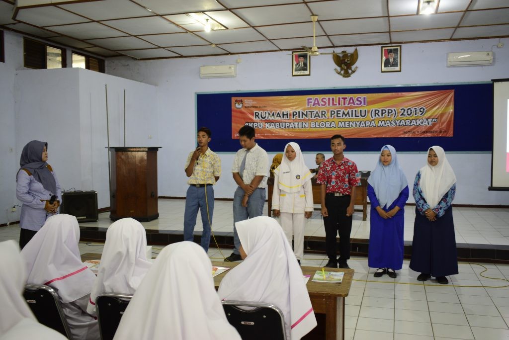 (09/10/2019)- KPU Blora menyapa mayarakat melalui Fasilitasi Rumah Pintar pemilu bagi Pra Pemilih yang diikuti oleh Siswa/Siswi 6 Sekolahan di Kabupaten Blora yaitu SMK Muhammadiyah 1 Blora, SMK Muhammadiyah 2 Blora, SMK Bhakti Husada, SMA N 1 Blora, SMA N 2 Blora, SMK N 2 Blora dengan seluruh jumlah peserta 96 Orang bertempat di Gedung PKP RI Blora.