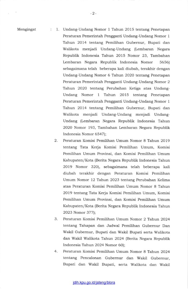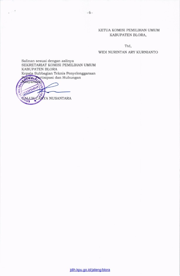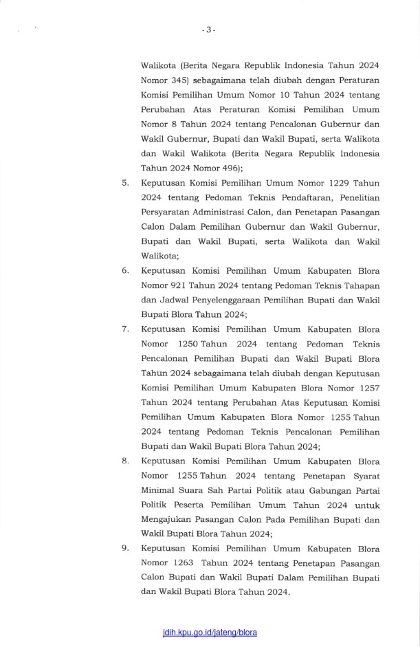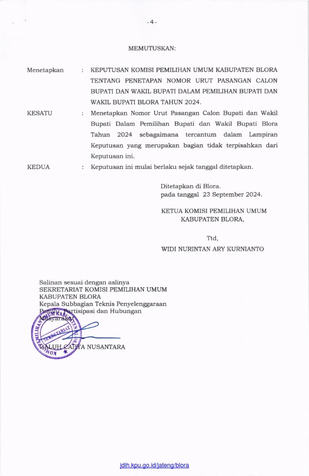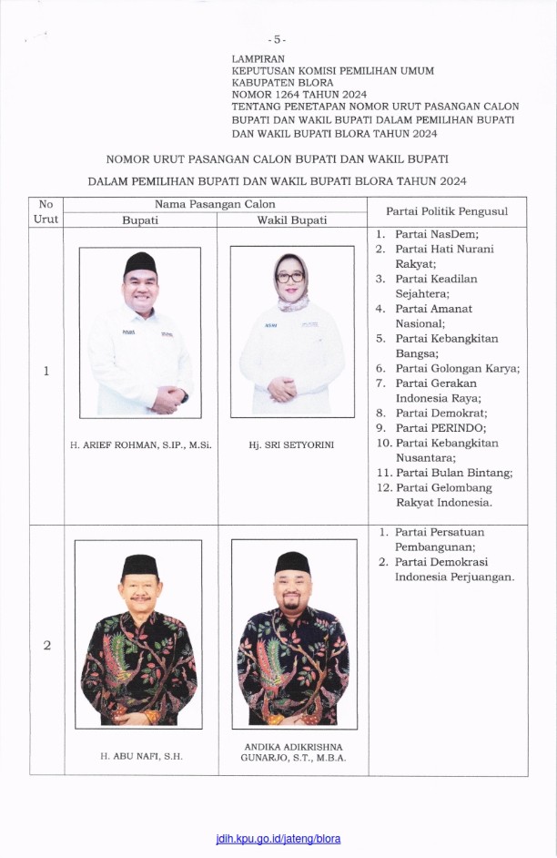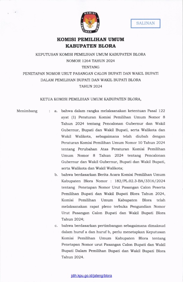 Keputusan KPU Kabupaten Blora Nomor 1264 Tahun 2024 tentang Penetapan Nomor Urut Pasangan Calon Bupati dan Wakil Bupati dalam Pemilihan Bupati dan Wakil Bupati Blora Tahun 2024 Senin, 23 September 2024 17:00 176 DOWNLOAD KEPUTUSAN Bagikan: Telah dilihat 176 kali