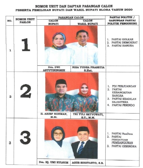 Pengumuman Penetapan Nomor Urut dan Daftar Paslon Bupati dan Wakil bupati Blora Tahun 2020 beserta Lampiran (SK Penetapan Nomor Urut) dapat unduh di sini.