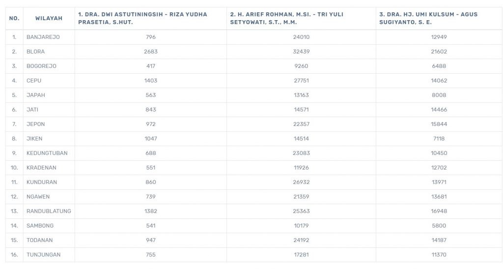 Rekapitulasi Hasil Penghitungan Perolehan Suara Pemilihan Bupati dan Wakil Bupati Blora dapat dilihat dan di unduh di bawah ini :