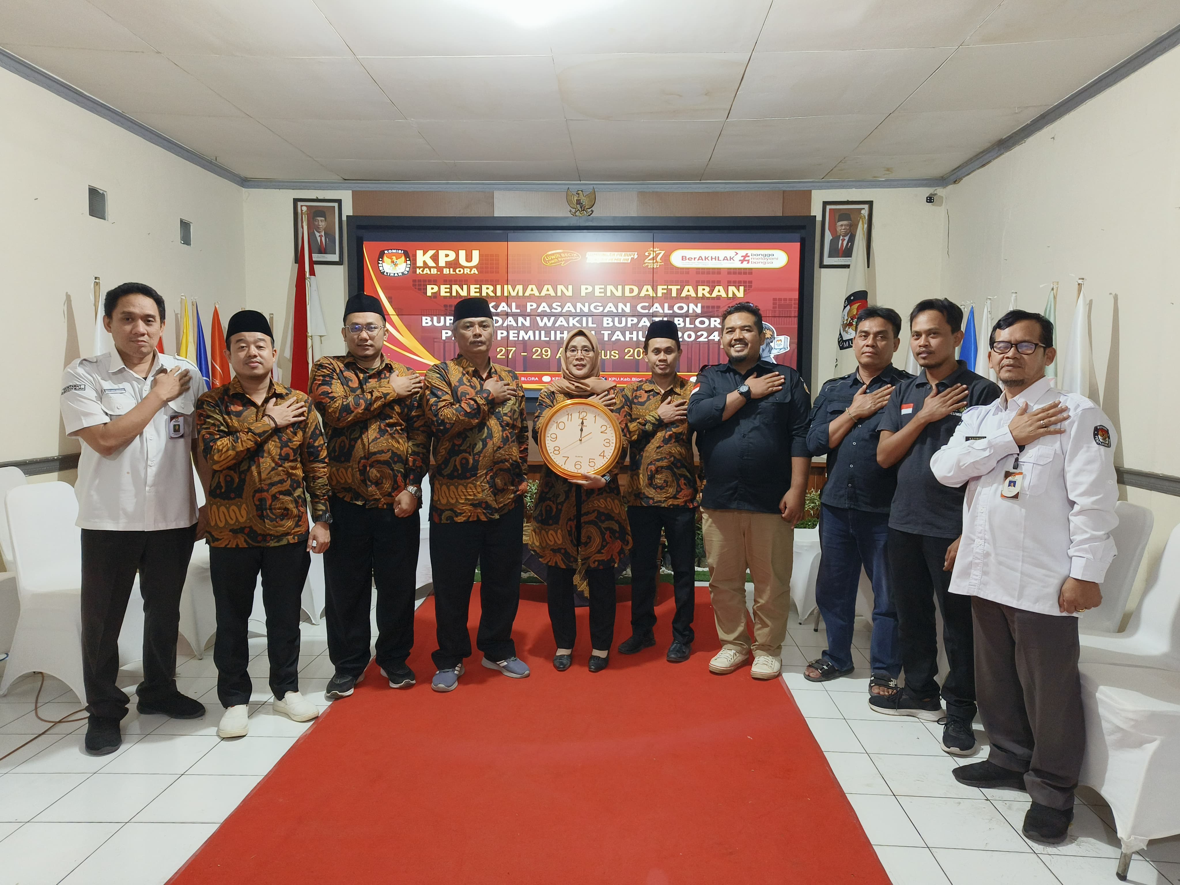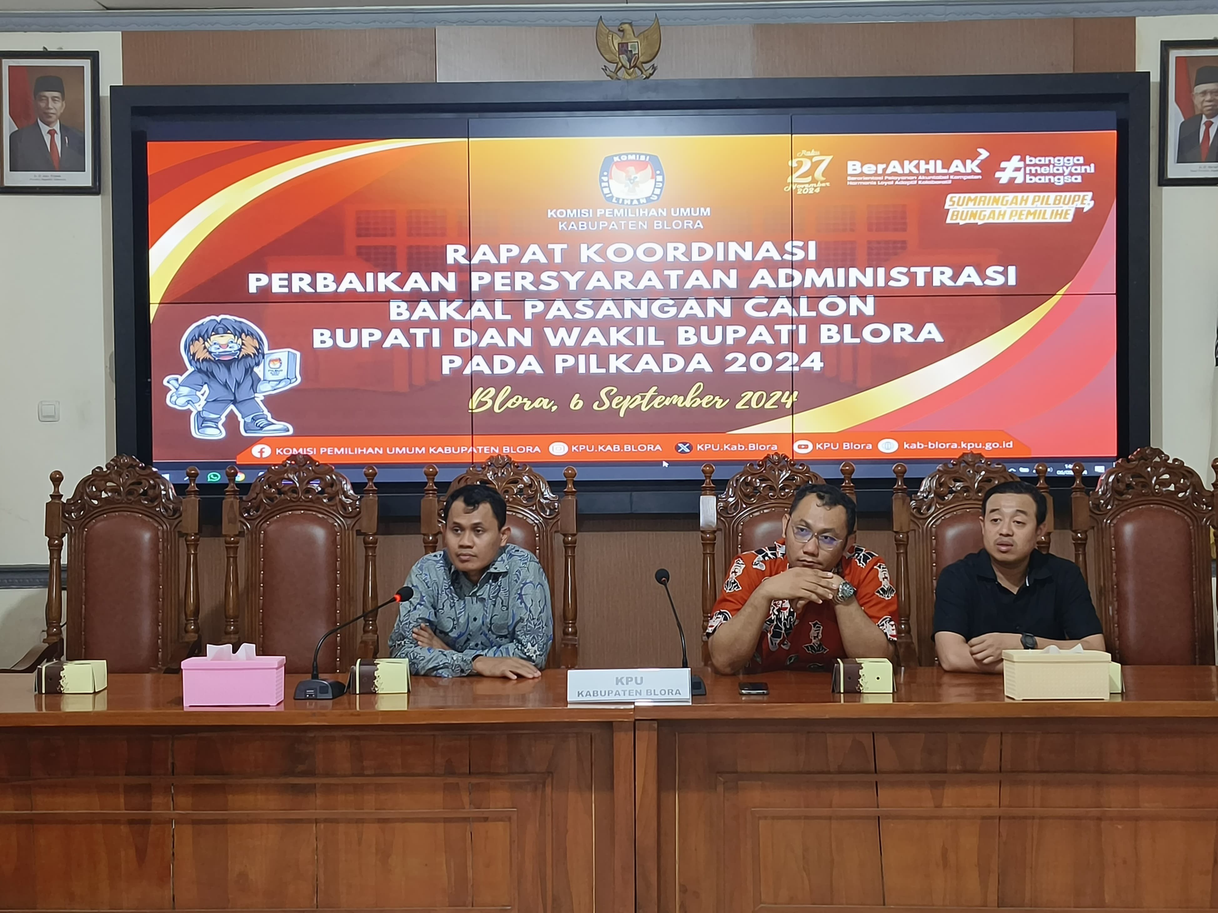 Blora - Komisi Pemilihan Umum (KPU) Blora menggelar Rapat Koordinasi Perbaikan Persyaratan Administrasi Bakal Pasangan Calon (Bapaslon) Bupati dan Wakil Bupati Blora Tahun 2024 di Aula Kantor KPU Blora, Jumat (6/9/2024). Materi disampaikan anggota KPU Divisi Teknis Penyelenggaraan, Ahmad Solikin didampingi Divisi Sosdiklih Parmas dan SDM, Ahmad Mustakim dan Divisi Hukum dan Pengawasan, Noorman Pramono. Turut hadir LO Bapaslon Bupati dan Wakil Bupati Blora Tahun 2024 dan Bawaslu kabupaten Blora. KPU Blora sebelumnya menyerahkan hasil verifikasi persyaratan administrasi dari kedua bakal pasangan calon bupati dan wakil bupati (Bacabup dan Bacawabup) Blora kemarin Jumat (6/9/2024) sekaligus hasil pemeriksaan kesehatan kedua bapaslon tersebut. Dari hasil penyerahan administrasi itu, masih ada berkas yang dinyatakan belum memenuhi syarat. Ahmad Solikin mengatakan, hasil verifikasi administrasi itu, ada sebagian dokumen yang perlu diperbaiki oleh masing-masing pasangan calon. Meliputi laporan laporan hasil kekayaan pejabat negara (LHKPN), Pasfoto berlatarbelakang putih, gelar haji dan visi misi kedua pasangan bacabup - bacawabup. "Hasil verifikasi administrasi semua pasangan calon belum memenuhi syarat. Kami batasi untuk perbaikan hingga 8 September. Jika tidak diperbaiki, maka tidak memenuhi syarat," ucapnya. Ia menambahkan, semua calon memenuhi syarat tes kesehatan. Untuk hasil verifikasi administrasi awal, ada beberapa dokumen yang harus diperbaiki dan belum memenuhi syarat. "Untuk laporan LHKPN itu masih ada yang baru melaporkan, namun baru-baru ini sudah diverifikasi KPK dan selanjutnya mengupload di sistem informasi pencalonan (Silon) Pilkada. Foto latar belakang bapaslon harus diperbaiki menjadi putih polos," terangnya. Dijelaskannya, untuk visi misi kedua cabup dan cawabup itu masih belum benar. Sesuai dengan peraturan KPU (PKPU) nomor 8 tahun 2024 yang menjelaskan bahwa visi misi calon harus sesuai rencana pembangunan jangka menengah dan panjang daerah (RPJMD) Kabupaten Blora. "Kedua paslon belum benar, maka yang punya kewenangan untuk verifikasi itu badan perencanaan dan pembangunan daerah (Bappeda). Hasil dari Bappeda, itu memang masih memerlukan waktu untuk pembenahan dan penjelasan masing-masing calon,” jelasnya. “Tapi secara garis besar sudah sesuai, namun ada beberapa yang masih perlu penjelasan agar lebih gamblang dibaca masyarakat," pungkasnya.