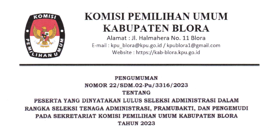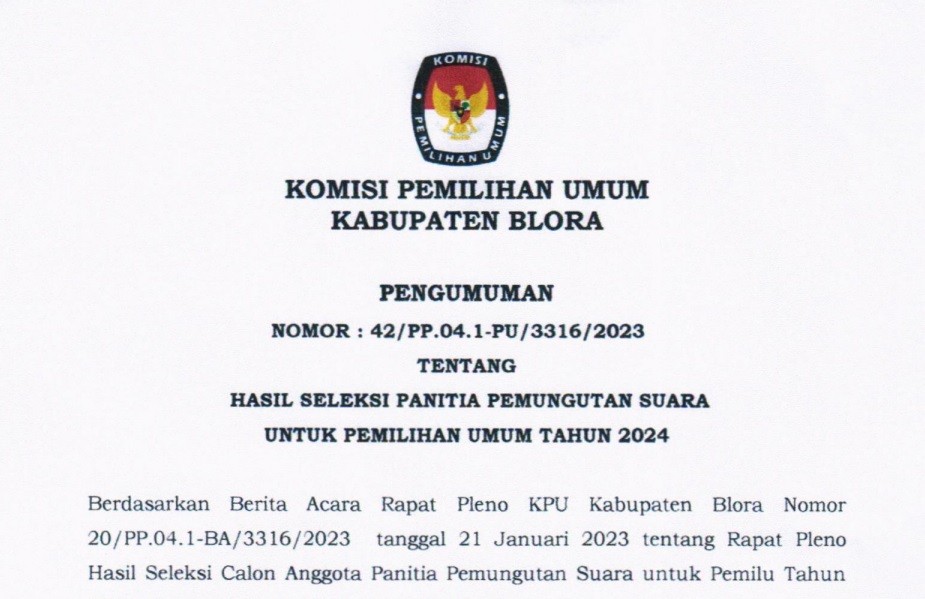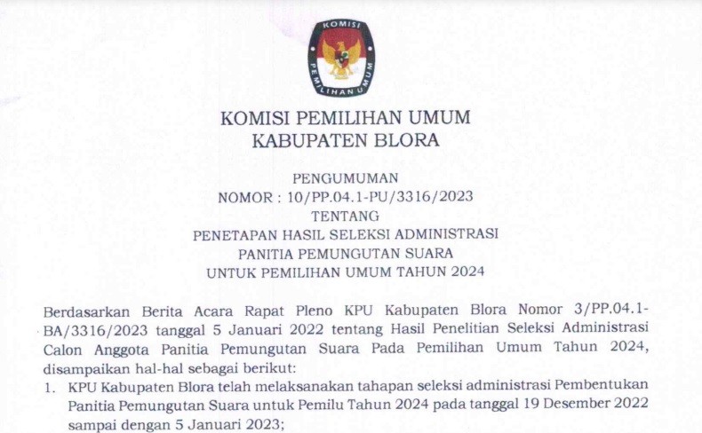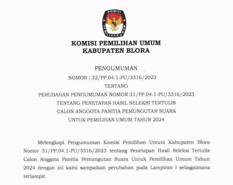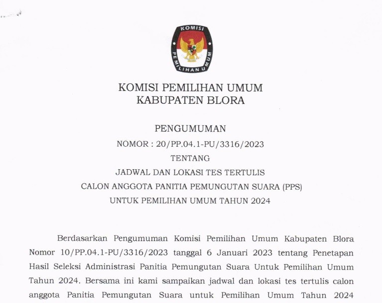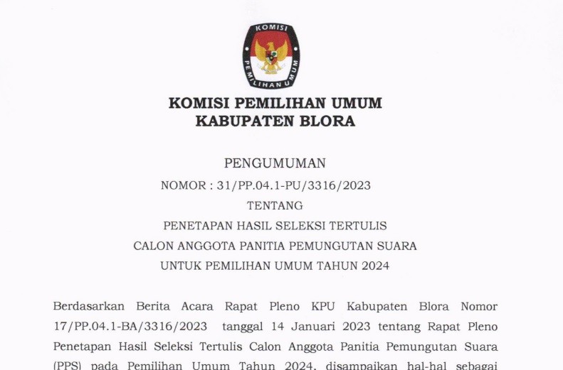 PENGUMUMAN PENETAPAN HASIL SELEKSI TERTULIS CALON PPS UNTUK PEMILU 2024 SE KABUPATEN BLORA . (LAMPIRAN I: YANG LULUS SELEKSI TERTULIS, LAMPIRAN II : JADWAL SELEKSI WAWANCARA)
