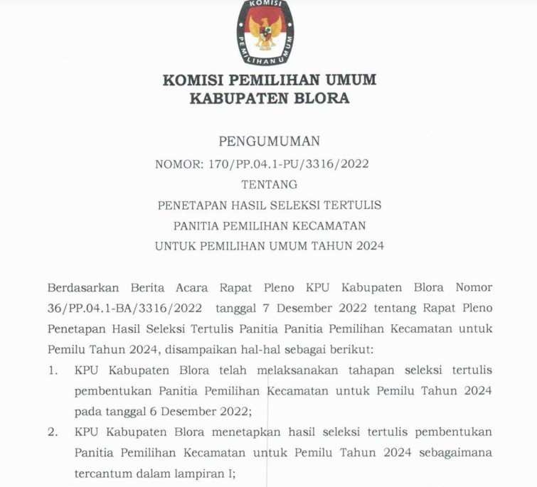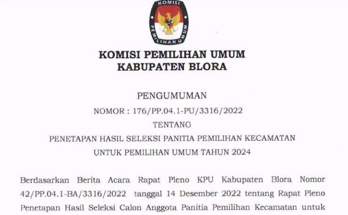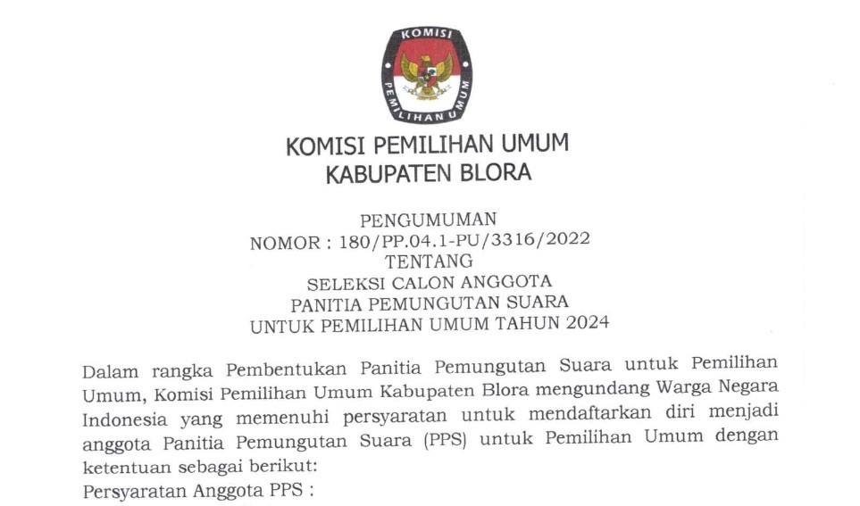 Pengumuman seleksi Calon PPS Pemilu 2024 Se Kab Blora. LIHAT DAN UNDUH DISINI