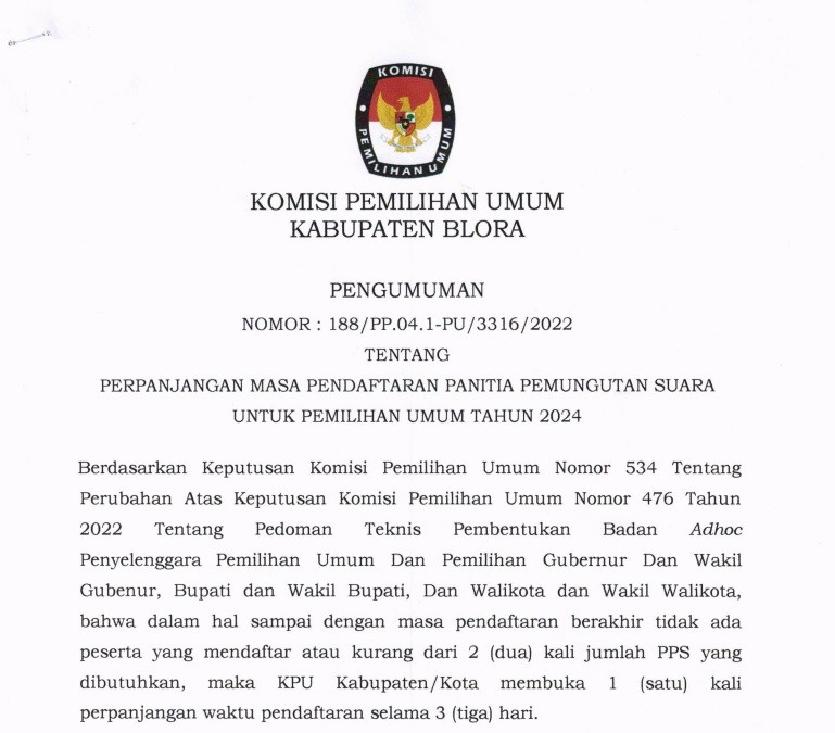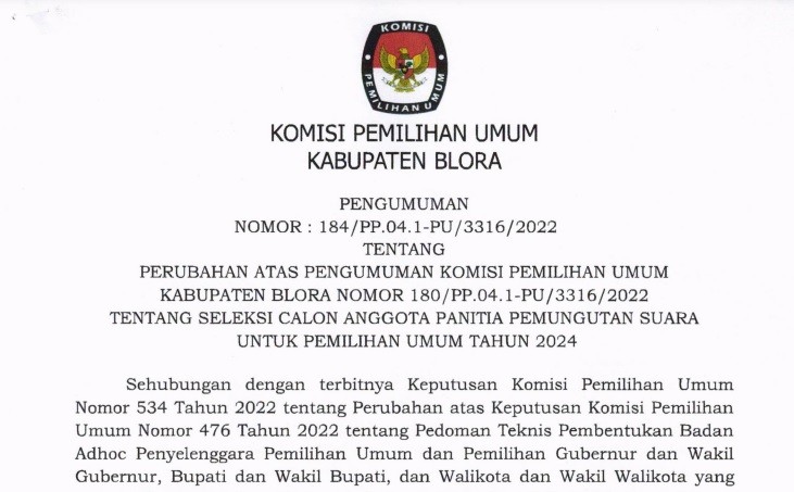 Perubahan Pengumuman seleksi Calon PPS Pemilu 2024 Se Kab Blora. LIHAT DAN UNDUH DISINI