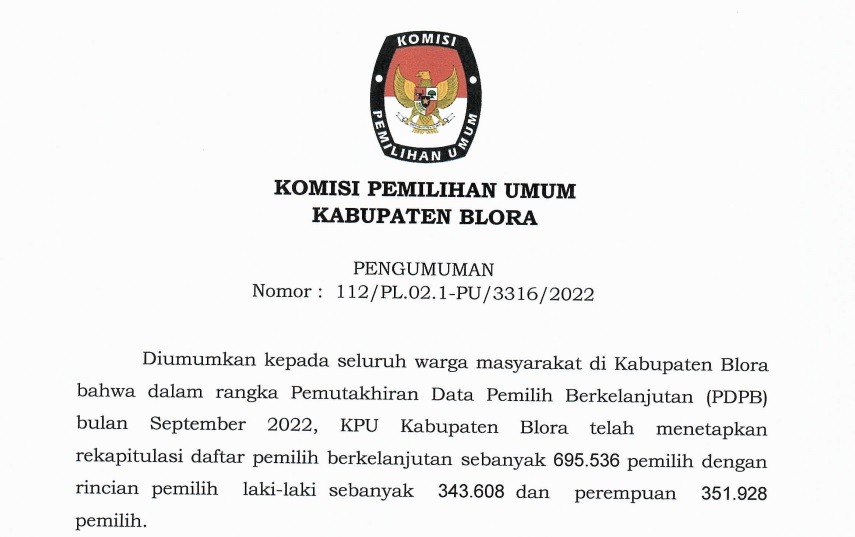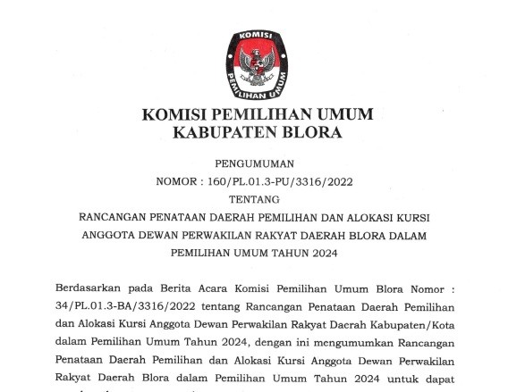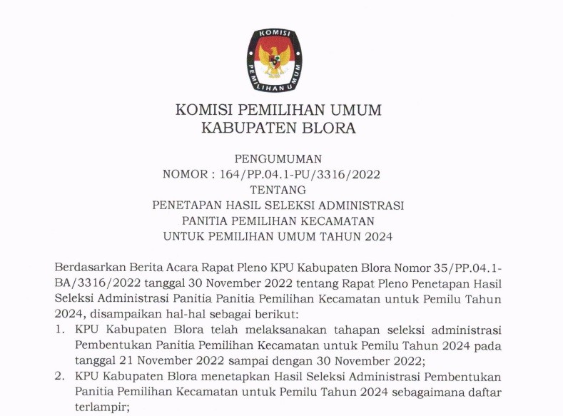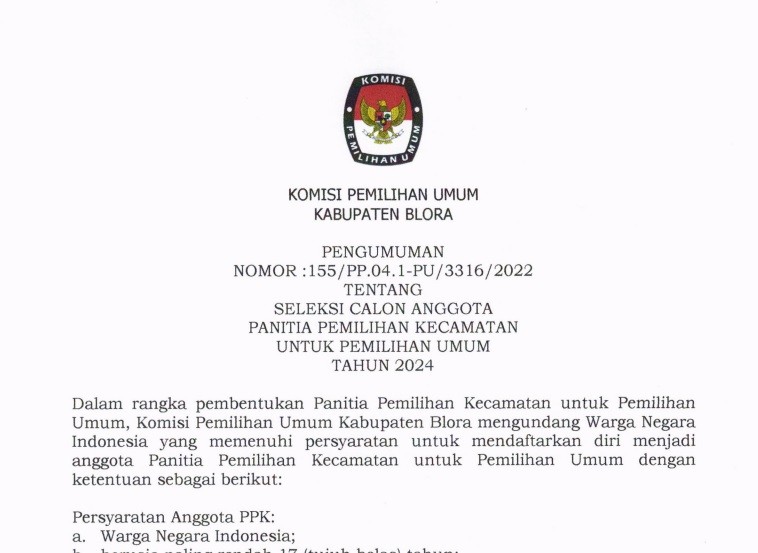 Pengumuman beserta lampiran Seleksi Calon Anggota PPK untuk Pemilu Tahun 2024 di Wilayah Kabupaten Blora. UNDUH DAN LIHAT DI SINI