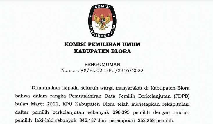 Pengumuman Daftar Pemilih Berkelanjutan Periode Bulan Maret 2022 Kabupaten Blora Kamis, 31 Maret 2022 00:00 58 Pengumuman Daftar Pemilih Berkelanjutan Periode Bulan Maret 2022 Kabupaten Blora. LIHAT dan UNDUH DISINI Baca Selengkapnya