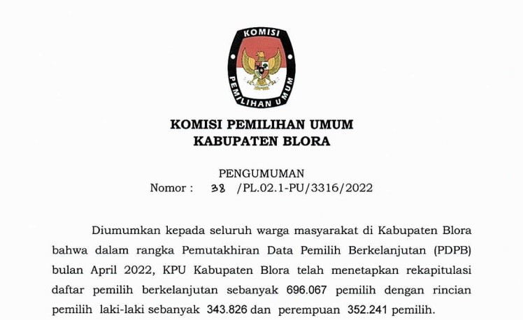Pengumuman Daftar Pemilih Berkelanjutan Periode Bulan April 2022 Kabupaten Blora Kamis, 28 April 2022 00:00 243 Pengumuman Daftar Pemilih Berkelanjutan Periode Bulan April 2022 Kabupaten Blora. LIHAT DAN UNDUH DISINI Baca Selengkapnya
