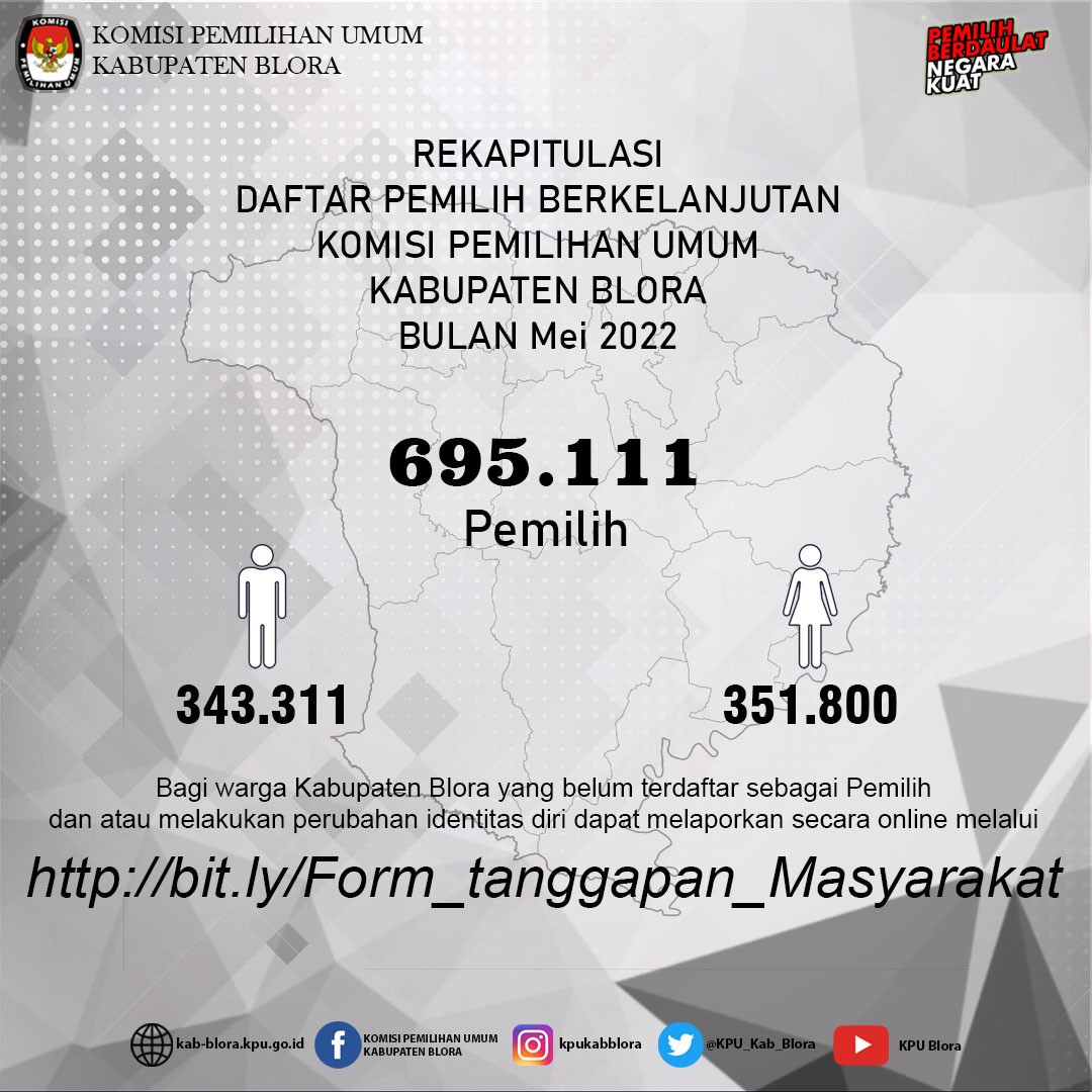 Pengumuman Daftar Pemilih Berkelanjutan Periode Bulan Mei 2022 Kabupaten Blora Senin, 30 Mei 2022 00:00 93 Pengumuman Daftar Pemilih Berkelanjutan Periode Bulan Mei 2022 Kabupaten Blora. KLIK DISINI Baca Selengkapnya