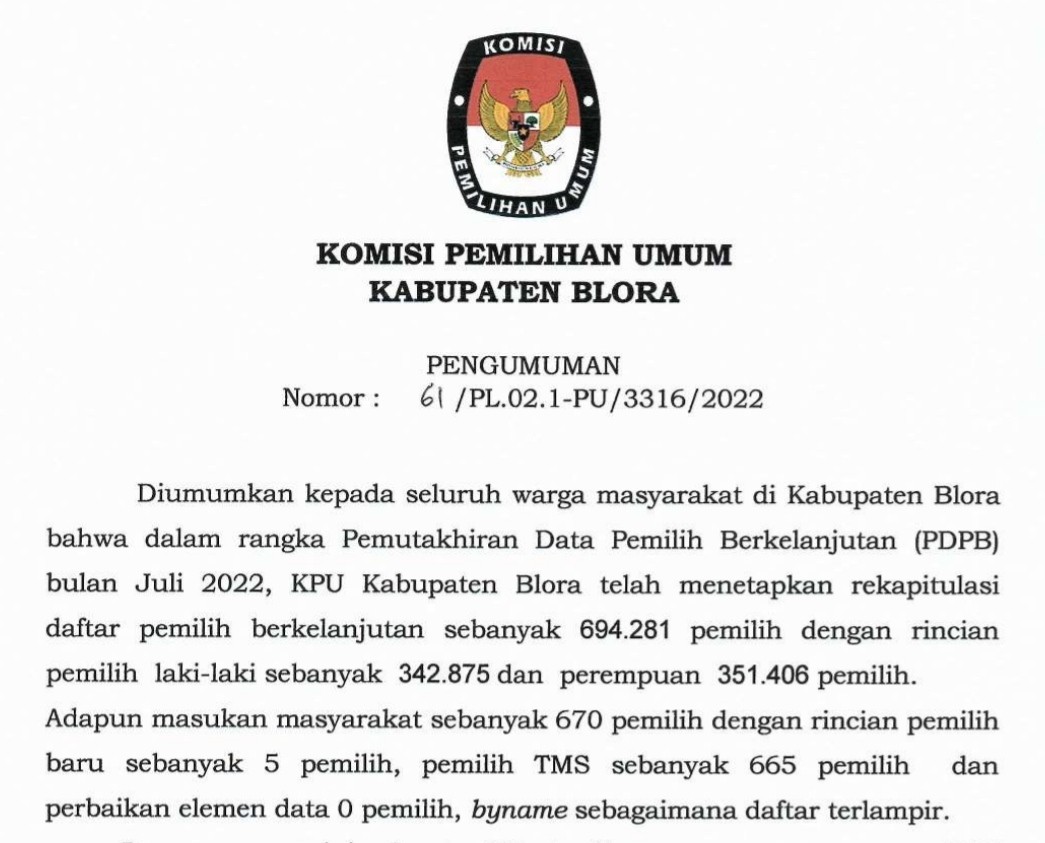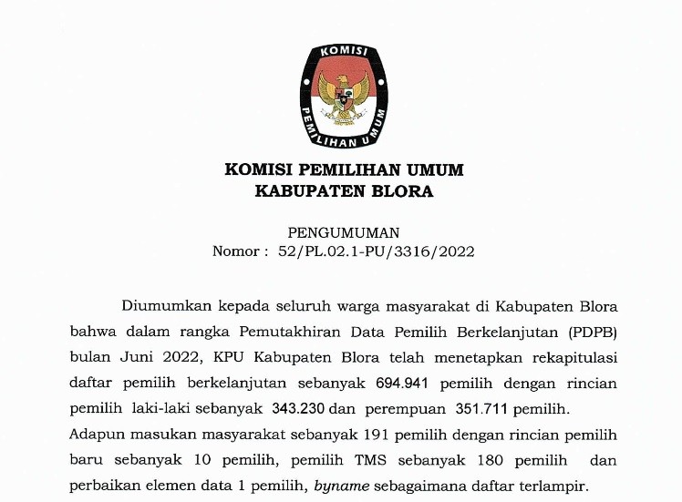 Pengumuman Daftar Pemilih Berkelanjutan Periode Bulan Juni 2022 Kabupaten Blora Selasa, 28 Juni 2022 00:00 82 Pengumuman Daftar Pemilih Berkelanjutan Periode Bulan Juni 2022 Kabupaten Blora. KLIK DISINI Baca Selengkapnya