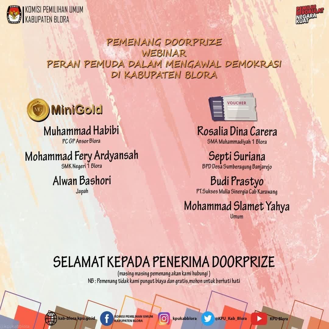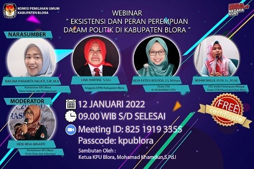Hai #temanpemilih catat tanggal webinar KPU Kab Blora dengan Tema " Eksistensi dan Peran Perempuan dalam Poltik di Kabupaten Blora"
