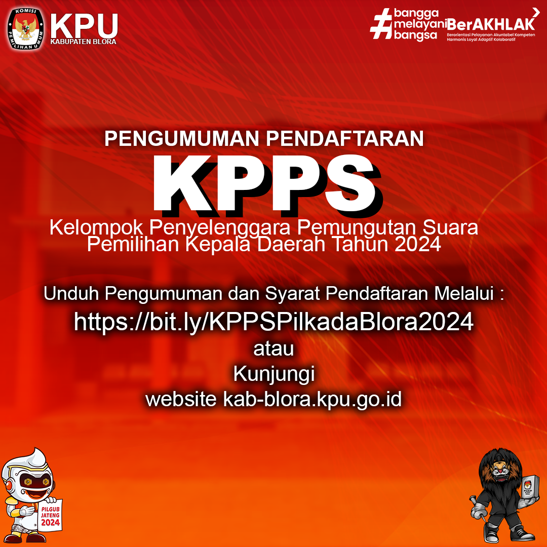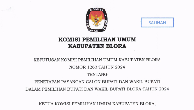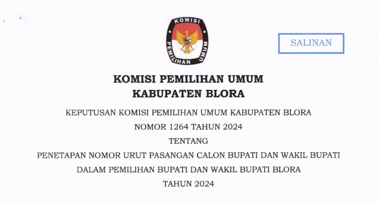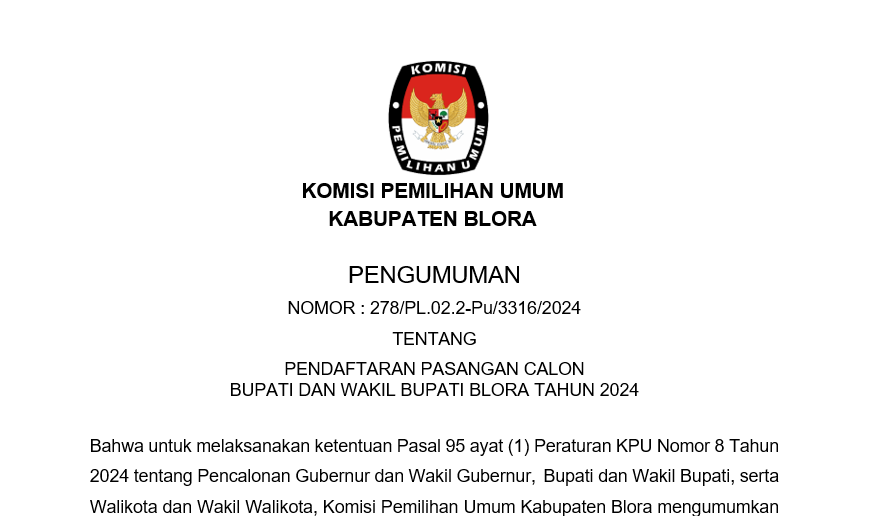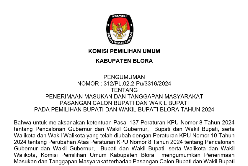 Pengumuman KPU Kabupaten Blora Nomor 312/PL.02.2-Pu/3316/2024 Tentang Penerimaan Masukan Dan Tanggapan Masyarakat Pasangan Calon Bupati Dan Wakil Bupati Pada Pemilihan Bupati Dan Wakil Bupati Blora Tahun 2024. LIHAT DAN UNDUH DISINI