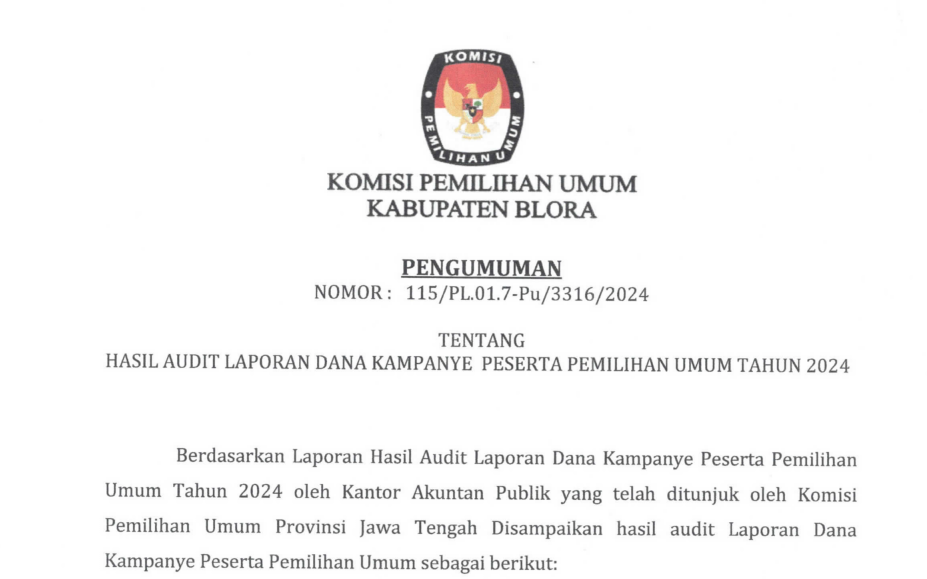 PENGUMUMAN SELEKSI CALON ANGGOTA PANITIA PEMILIHAN KECAMATAN UNTUK PEMILIHAN GUBERNUR DAN WAKIL GUBERNUR JAWA TENGAH SERTA PEMILIHAN BUPATI DAN WAKIL BUPATI BLORA TAHUN 2024. LIHAT DAN UNDUH DISINI