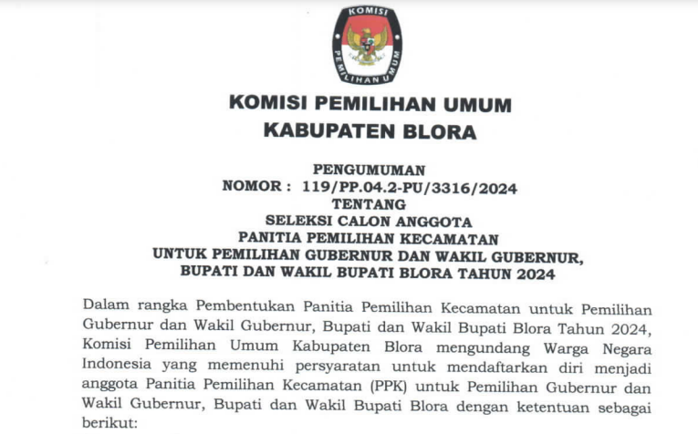 PENGUMUMAN PERPANJANGAN SELEKSI CALON ANGGOTA PANITIA PEMILIHAN KECAMATAN UNTUK PEMILIHAN GUBERNUR DAN WAKIL GUBERNUR JAWA TENGAH SERTA PEMILIHAN BUPATI DAN WAKIL BUPATI BLORA TAHUN 2024 LIHAT DAN UNDUH DISINI