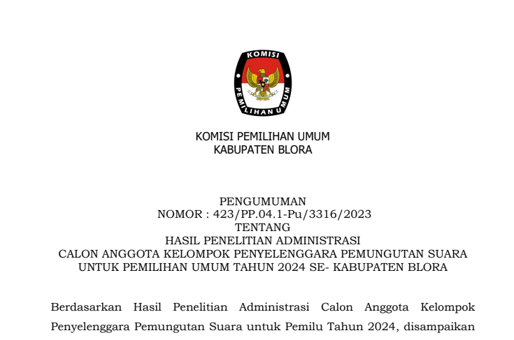 PENGUMUMAN HASIL PENELITIAN ADMINISTRASI CALON ANGGOTA KPPS UNTUK PEMILU TH 2024 SE KAB. BLORA Sabtu, 23 Desember 2023 20:00 423 PENGUMUMAN HASIL PENELITIAN ADMINISTRASI CALON ANGGOTA KPPS UNTUK PEMILU TH 2024 SE KAB. BLORA. LIHAT dan UNDUH DISINI Baca Selengkapnya