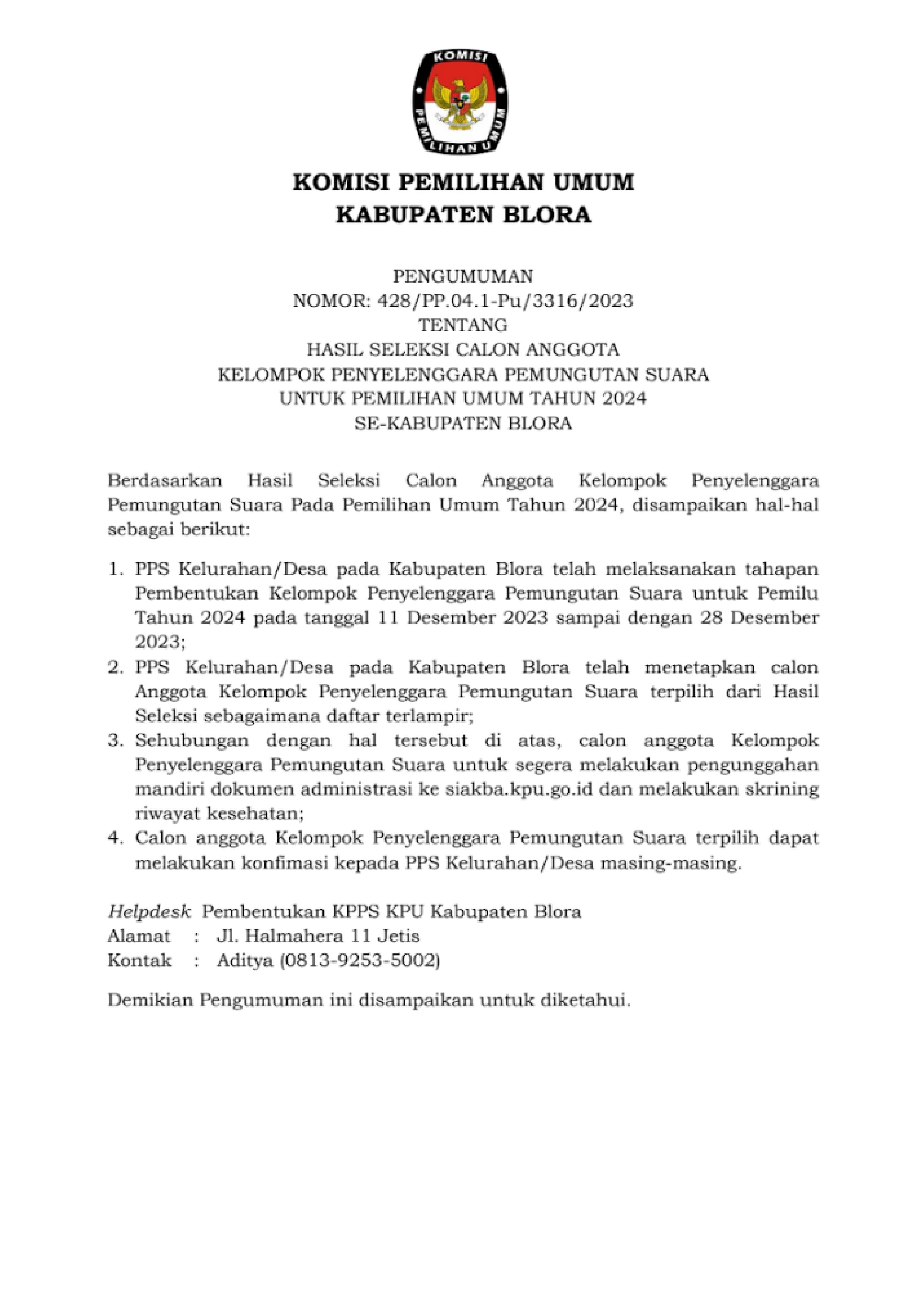 PENGUMUMAN HASIL SELEKSI CALON ANGGOTA KPPS Sabtu, 30 Desember 2023 07:00 647 PENGUMUMAN HASIL SELEKSI CALON ANGGOTA KPPS UNTUK PEMILU TAHUN 2024 KABUPATEN BLORA. KLIK DISINI Baca Selengkapnya