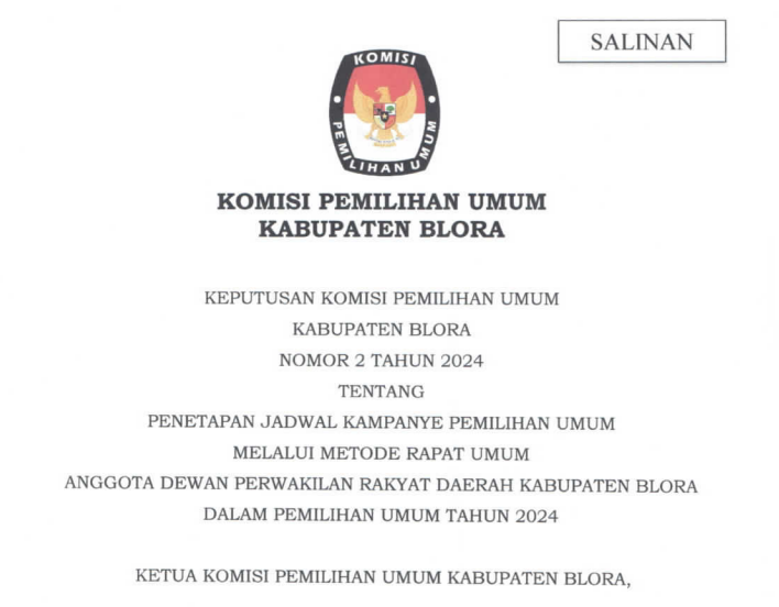 SK KPU KAB. BLORA TENTANG PENETAPAN JADWAL KAMPANYE MELALUI METODE RAPAT UMUM ANGGOTA DPRD KABUPATEN BLORA DALAM PEMILU TAHUN 2024 Jumat, 19 Januari 2024 22:00 113 SK KPU KAB. BLORA TENTANG PENETAPAN JADWAL KAMPANYE MELALUI METODE RAPAT UMUM ANGGOTA DPRD KABUPATEN BLORA DALAM PEMILU TAHUN 2024. KLIK DISINI Baca Selengkapnya