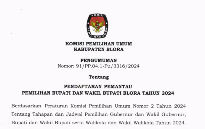 Pengumuman Pendaftaran Lembaga Pemantau Pemilihan Bupati dan Wakil Bupati Blora Tahun 2024 Selasa, 27 Februari 2024 07:00 83 PENGUMUMAN NOMOR 255/PP.03.2/3327/2024 TENTANG PENDAFTARAN PEMANTAU PEMILIHAN BUPATI DAN WAKIL BUPATI BLORA TAHUN 2024 dapat diunduh disini Baca Selengkapnya