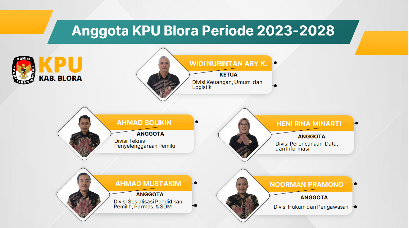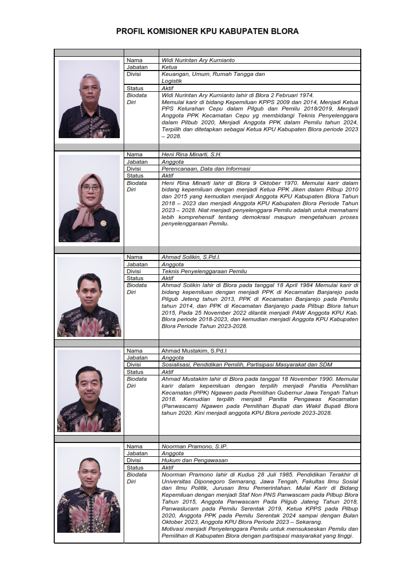 PROFIL KOMISIONER KPU KABUPATEN BLORA Berikut Profil Komisoner KPU Kabupaten Blora. KLIK DISINI Share this artikel : Dilihat 225 Kali.